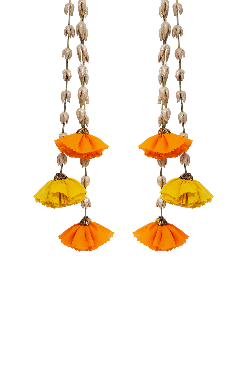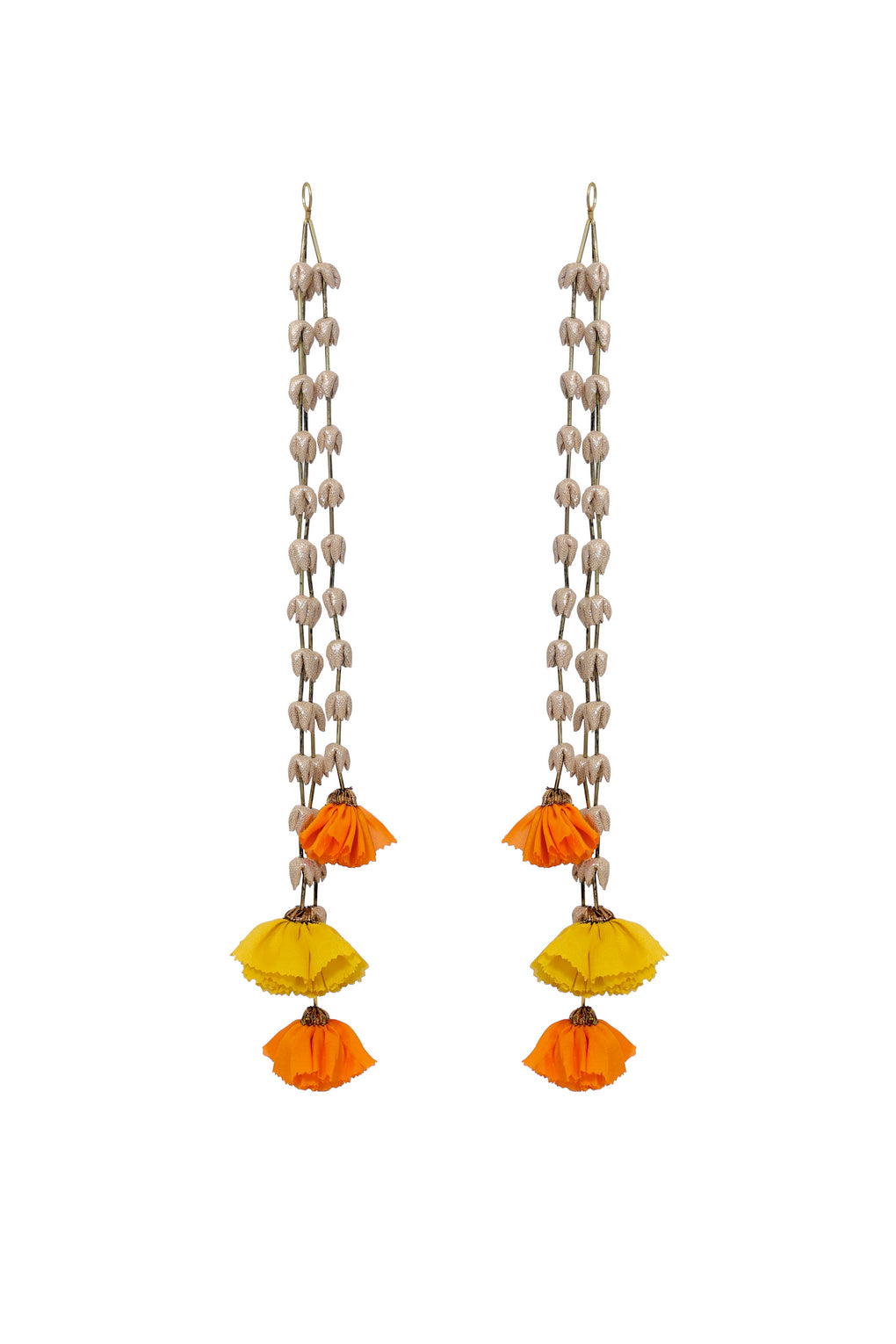 Teen Ladi Latkans, a trio of elegance and warmth for your home. Crafted from shimmering golden mogra flowers that cascade into vibrant genda blossoms in sunny orange and yellow, these three-strand latkans are a feast for the eyes. Perfect for festivities or to elevate everyday decor, they add those special details that transform a house into a home.