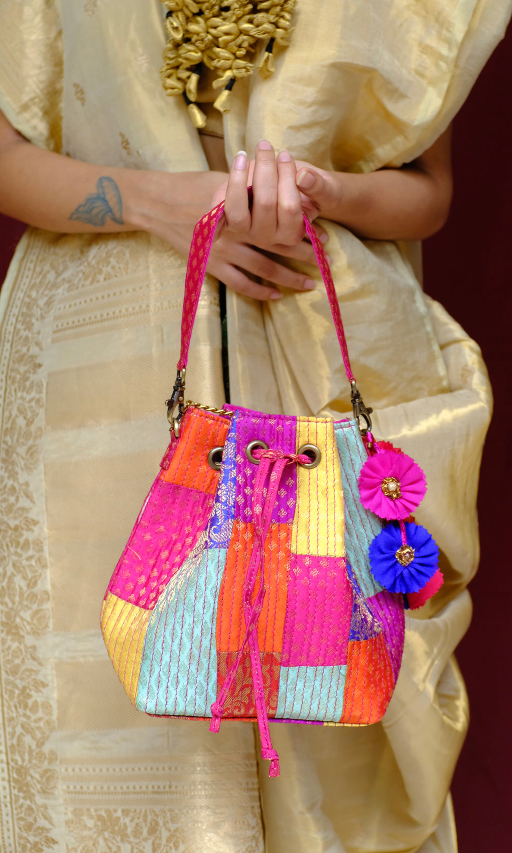 A delightful bag that can be carried as a handbag or a potli or a sling. It can be styled with a sari or a dress. Made from a patchwork of colourful brocade fabrics and finished with our signature flower trim.