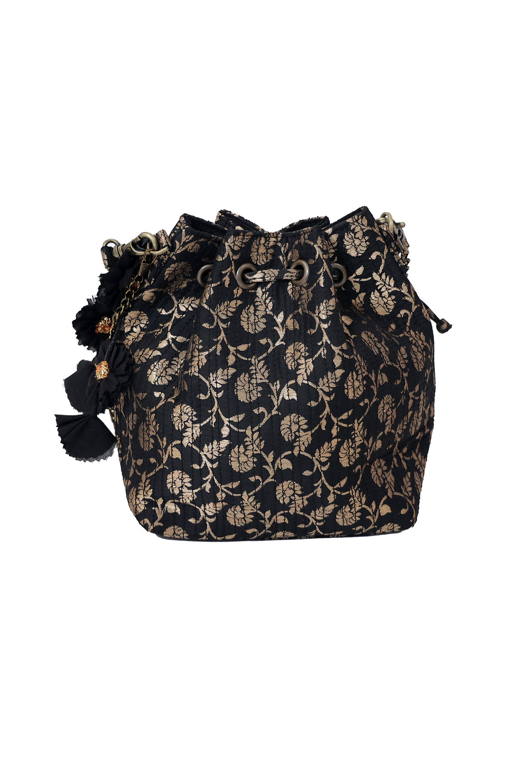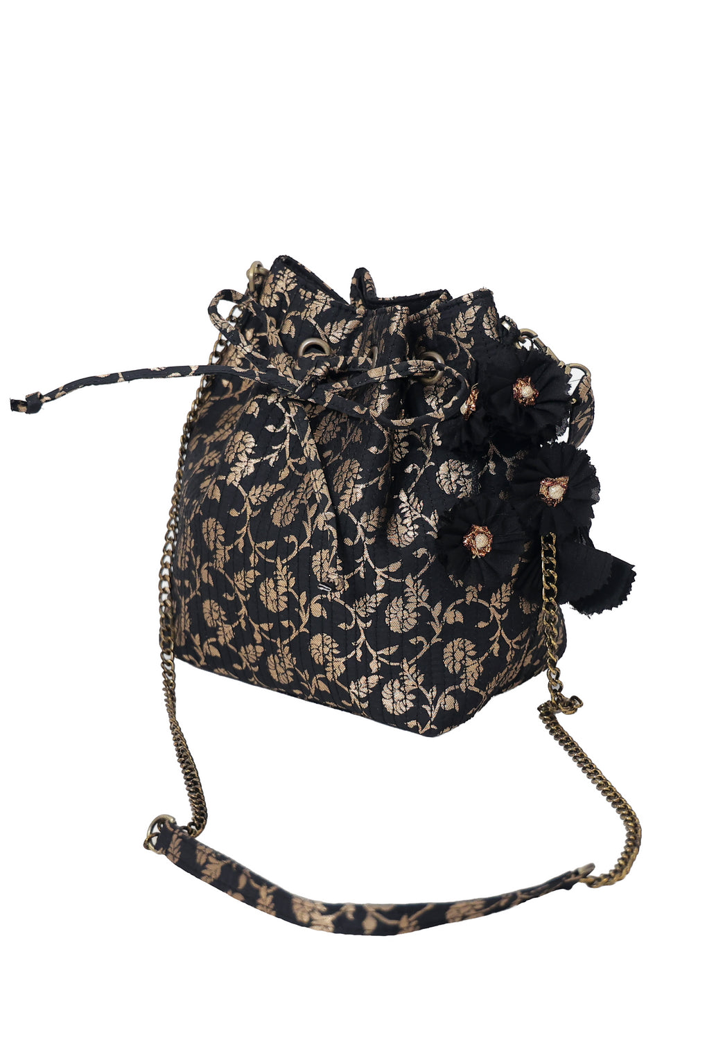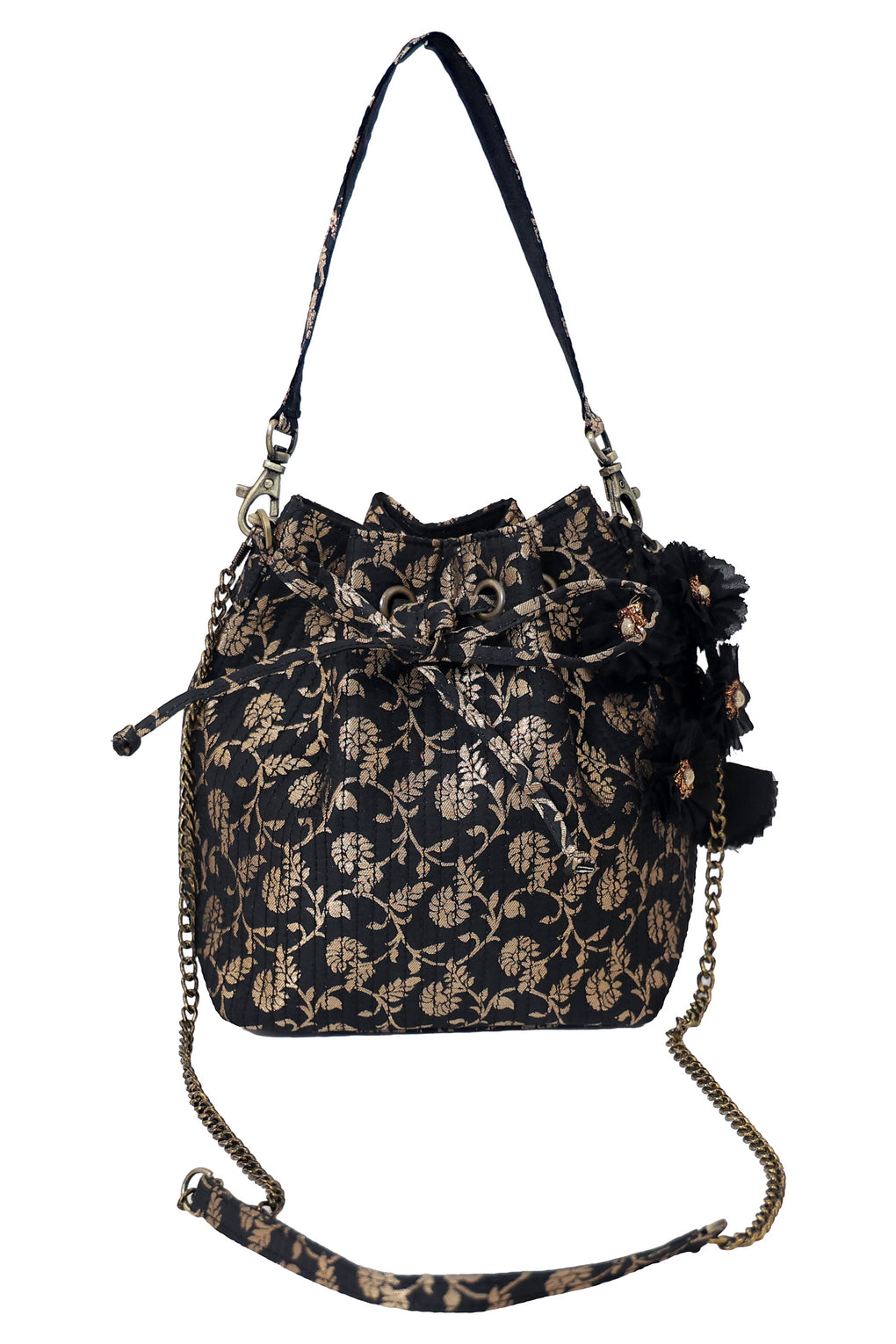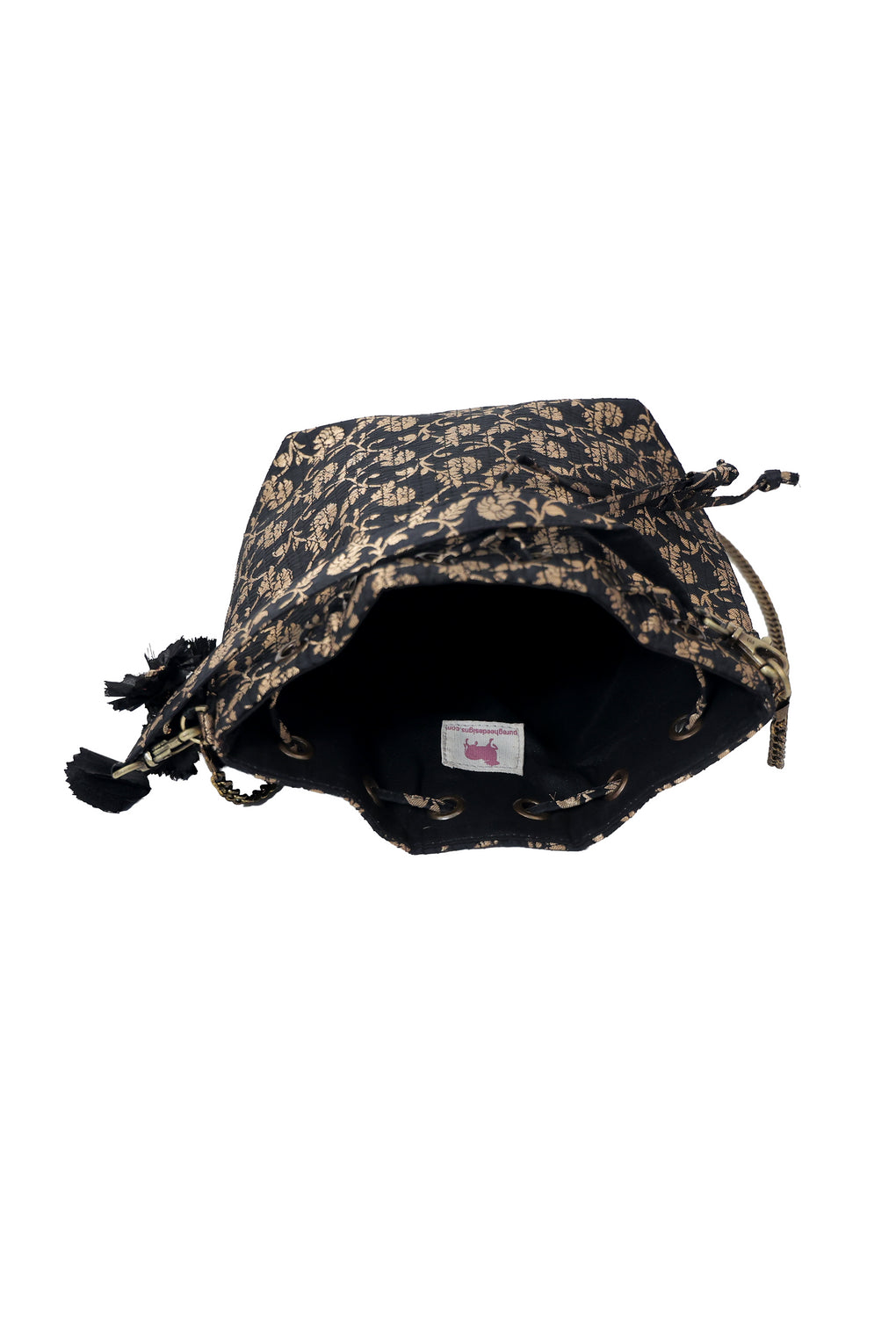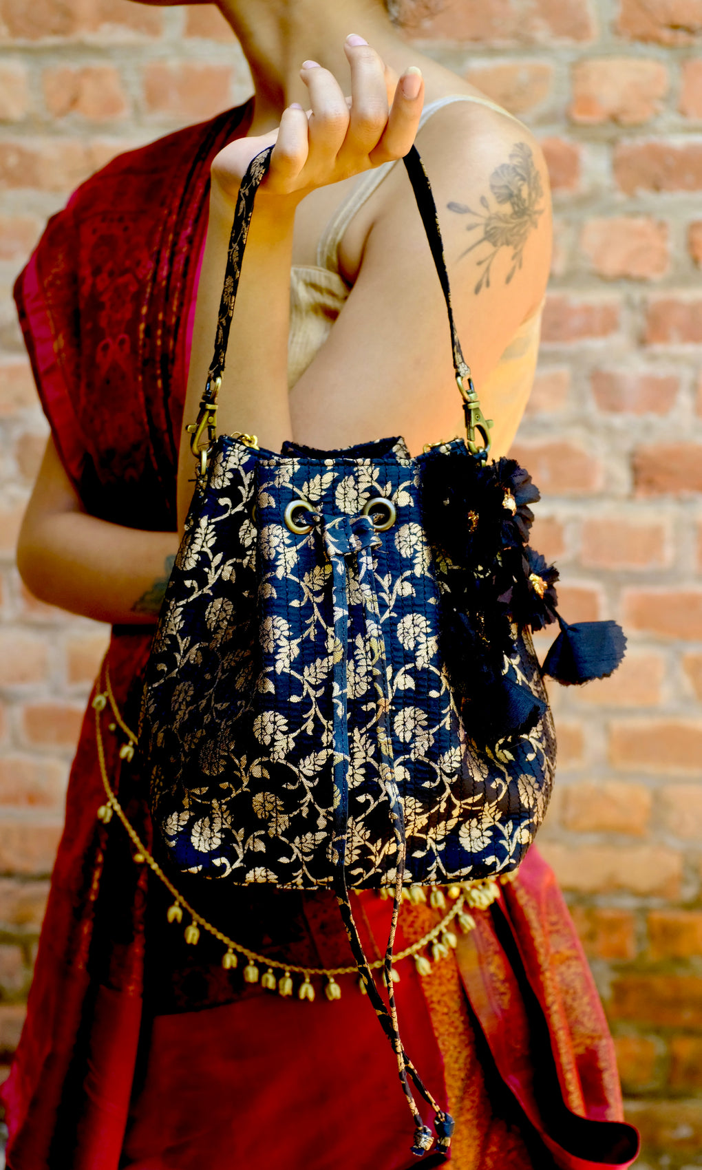 A delightful bag that can be carried as a handbag or a potli or a sling. It can be styled with a sari or a dress. Made from a patchwork of colourful brocade fabrics and finished with our signature flower trim.