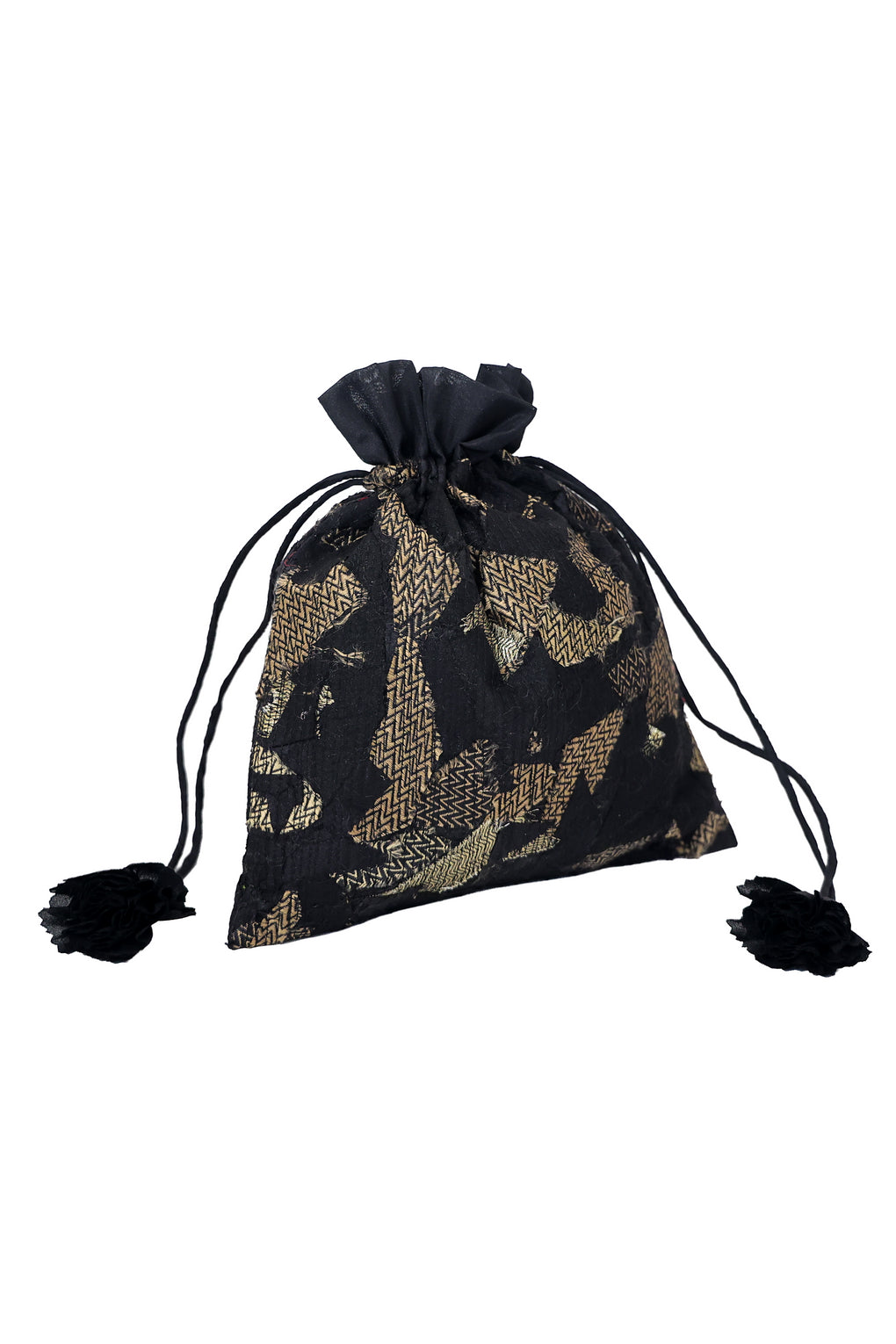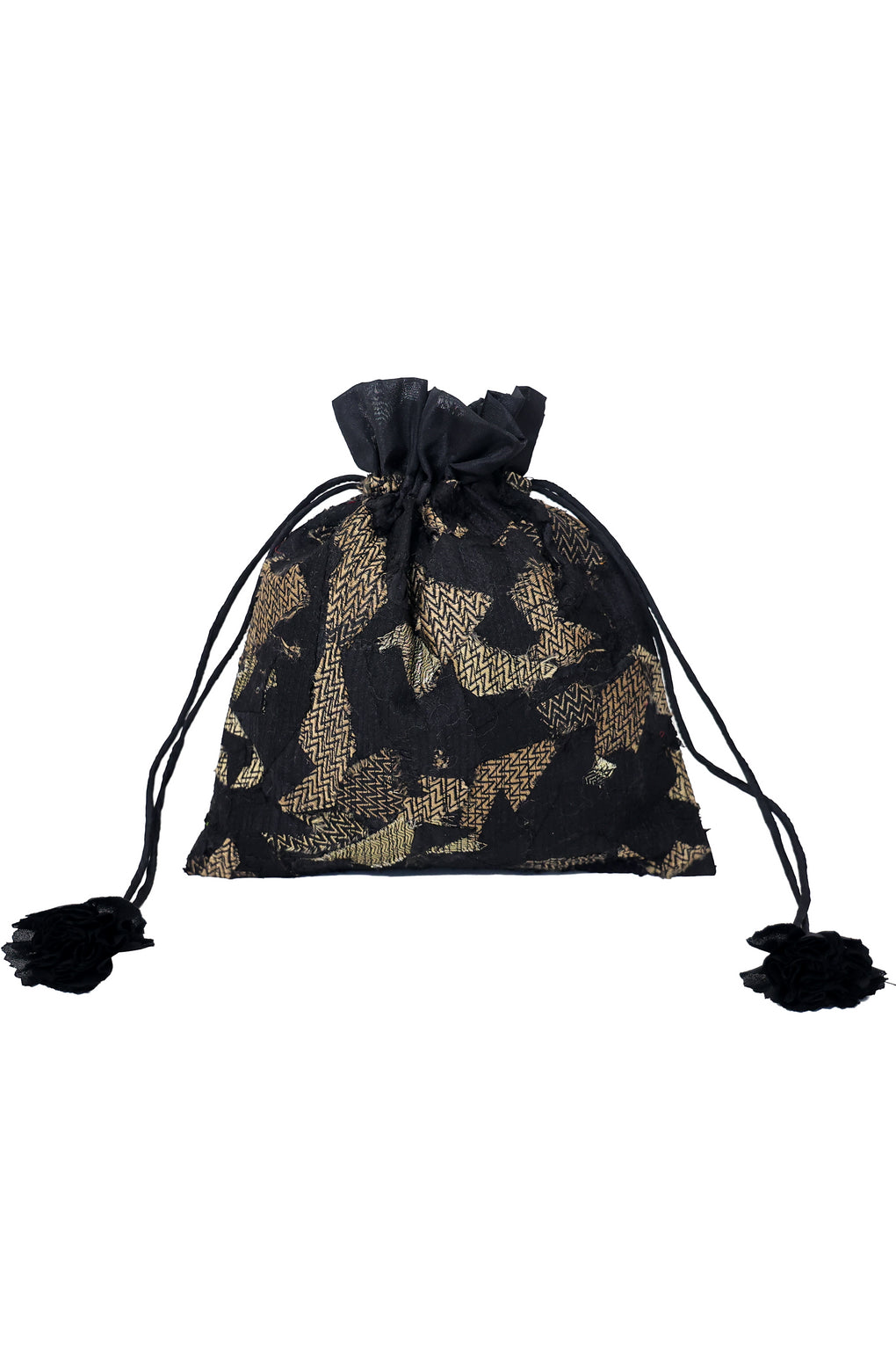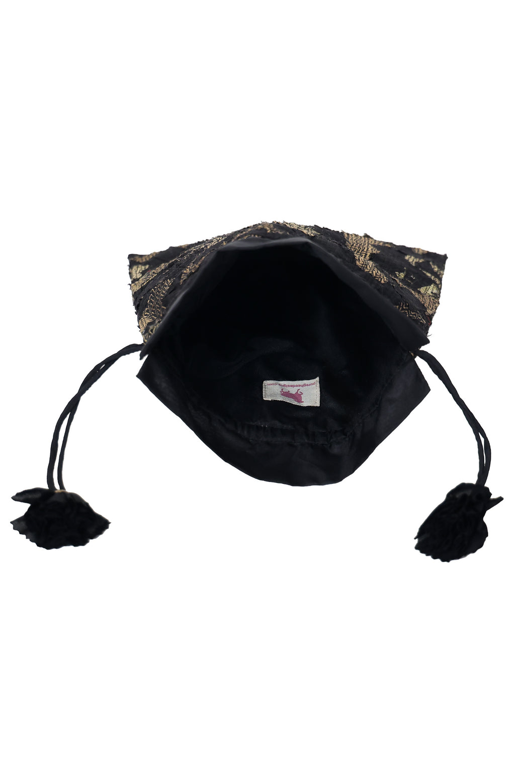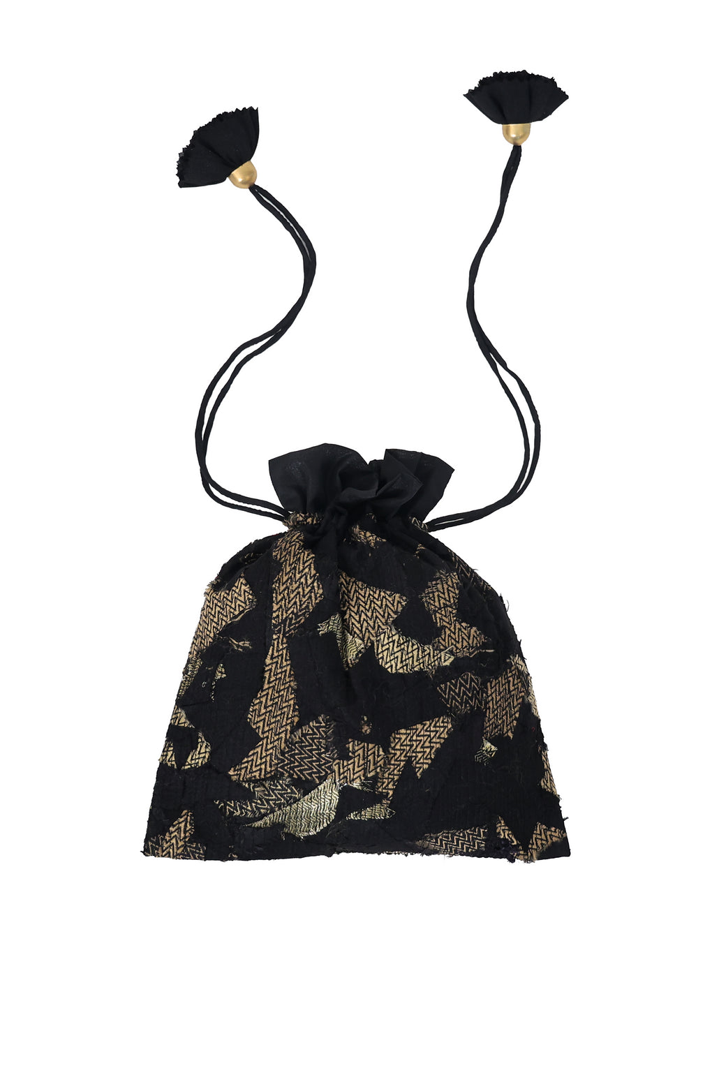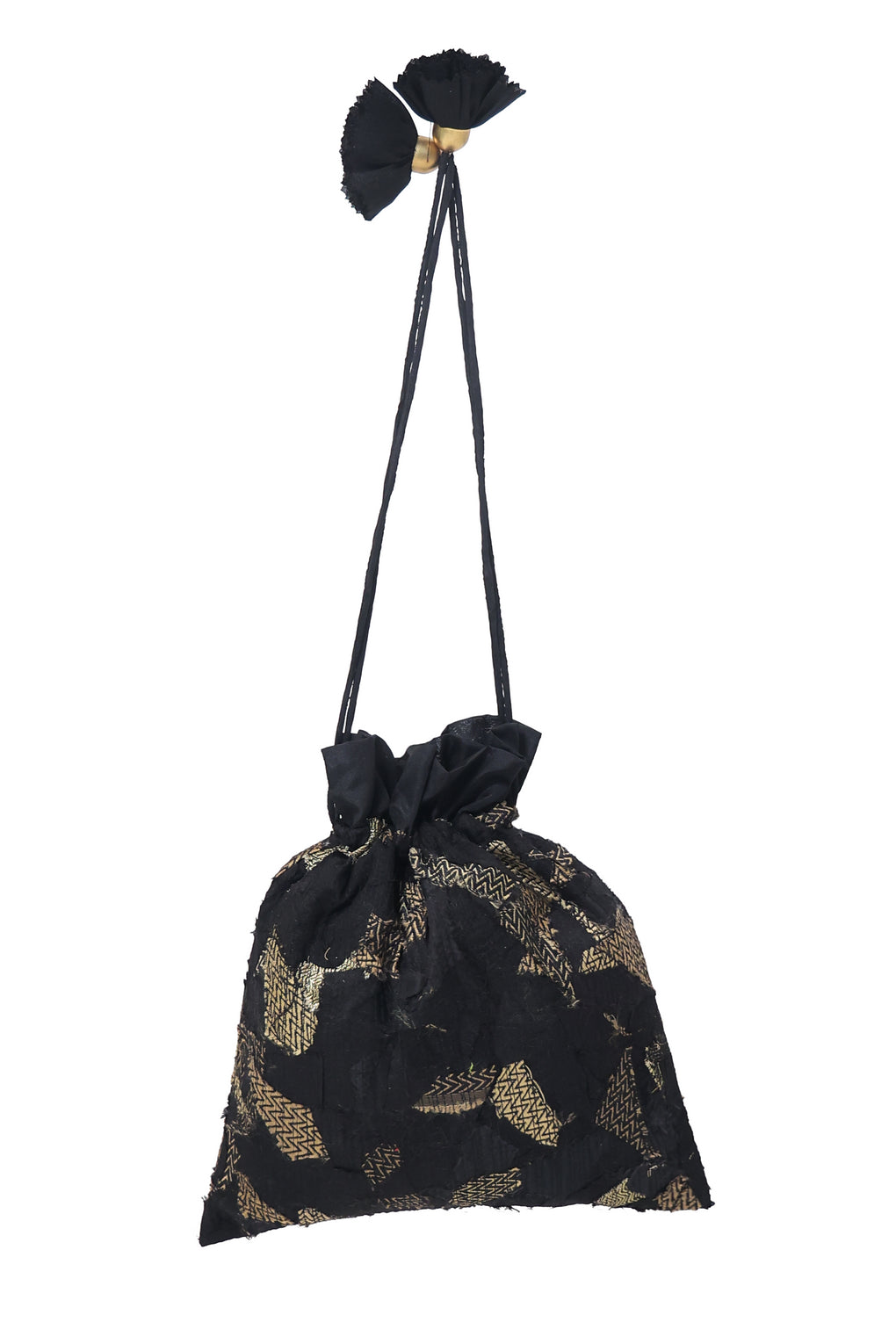 The Black Katran Potli is made from up cycled fabric waste. The waste fabric goes through a time consuming process of collecting, sorting and quilting together the tiniest bits to create a lush and textured surface. Each piece in this collection is one-of-a-kind. A unique potli, the colour and finish of this bag will make it a favourite addition to your evening esemble.